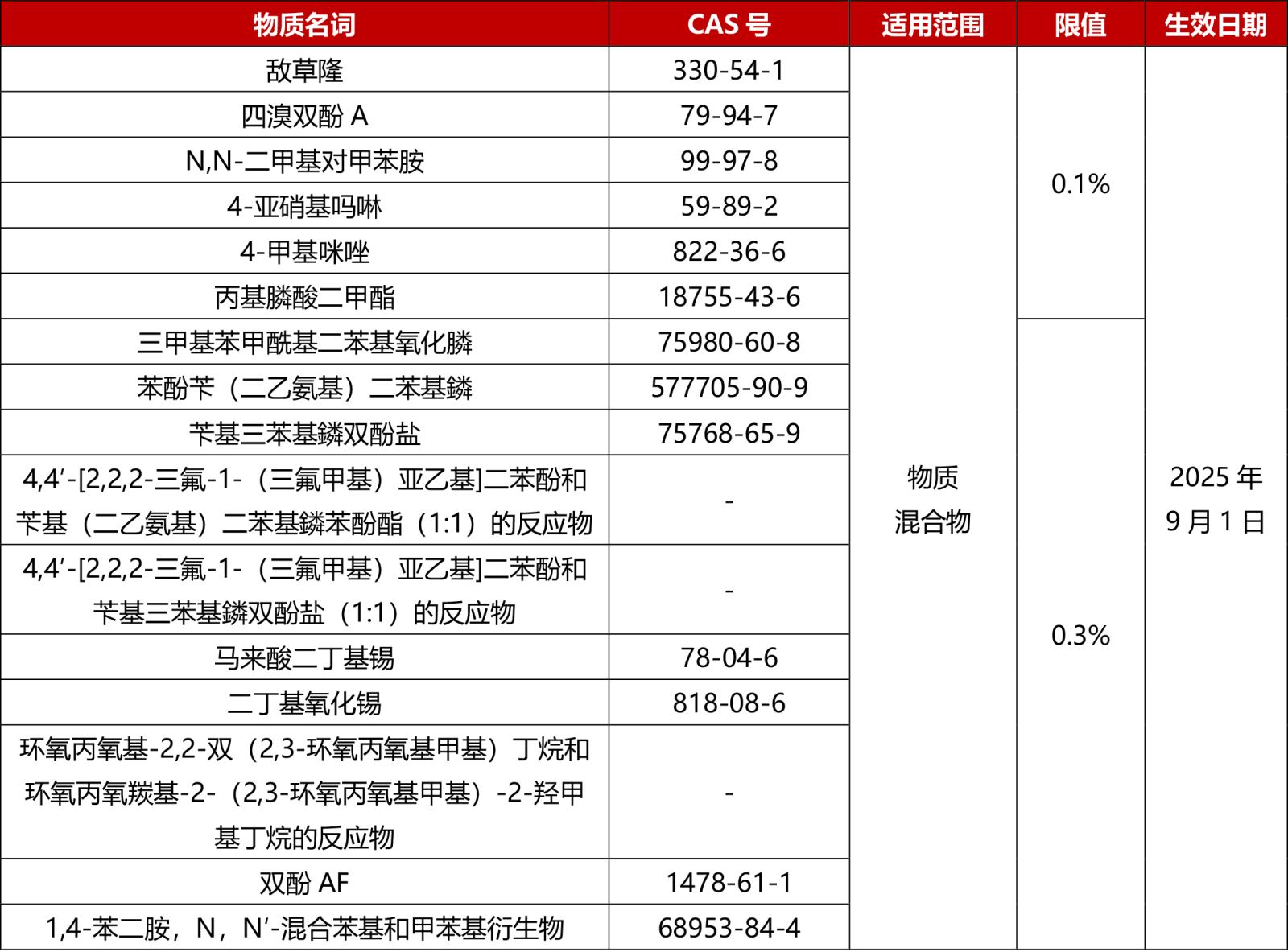2025年9月1日,欧洲化学品管理局(ECHA)对3项SVHC意向物质展开公众咨询。公众咨询将于2025年10月16日结束,在公众咨询期结束前,各利益相关方均可向ECHA提交评议意见,ECHA将对反馈意见进行评议,通过评议的物质将被正式加入SVHC候选物质清单。