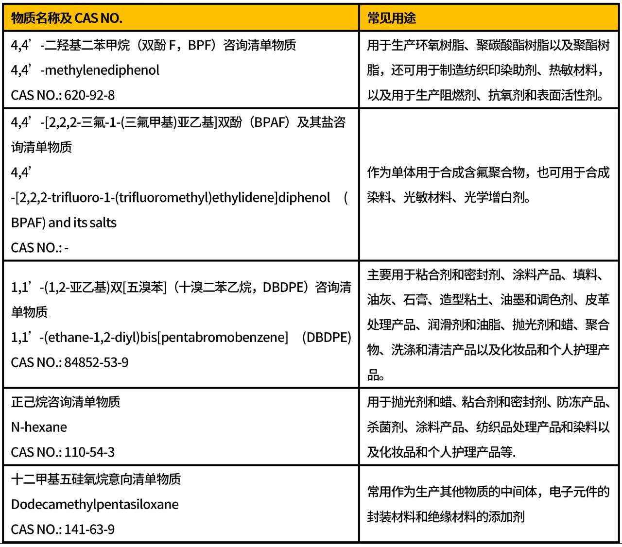 目前,SVHC咨询清单物质共4项,意向清单物质1项,清单如下表: