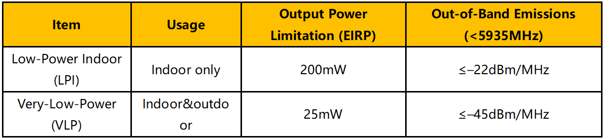 • 新增了工作频率为5925-7125MHz的WLAN设备的时间平均吸收功率密度(TA-APD)要求。