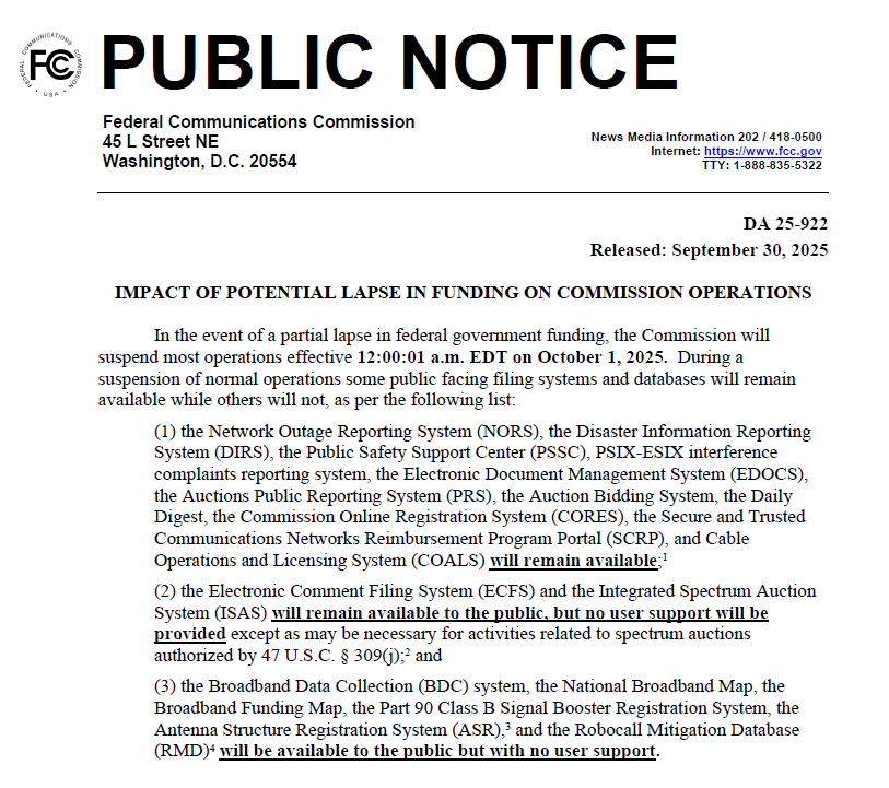 10月1日起,美国联邦通信委员会(FCC)因联邦政府资金未到位,正式启动了应急停摆程序。受此影响,暂停运营期间所有FCC ID认证的签发工作均已暂停。此次暂停属于不可抗力事件,具体的恢复运营时间需等待FCC的官方进一步通知。电子产品上市节奏将被影响,哪些环节被按下暂停键?您的认证、库存、销售会受多大波及?下文带您一起关注。
