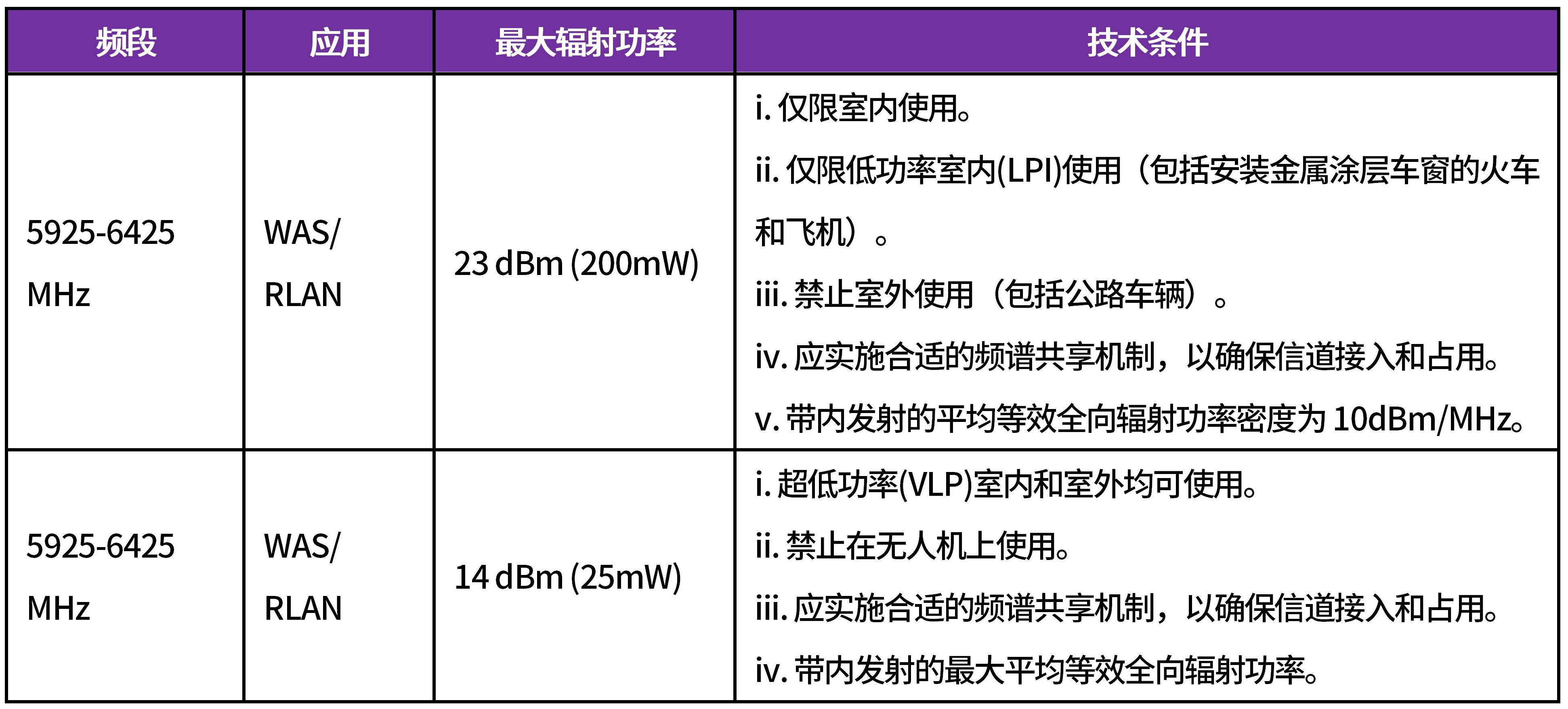 根据该提案草案,NCA授权将5925-6425 MHz (L6GHz)频段用于无线接入系统/无线局域网,初步制定的技术和操作条件如下: