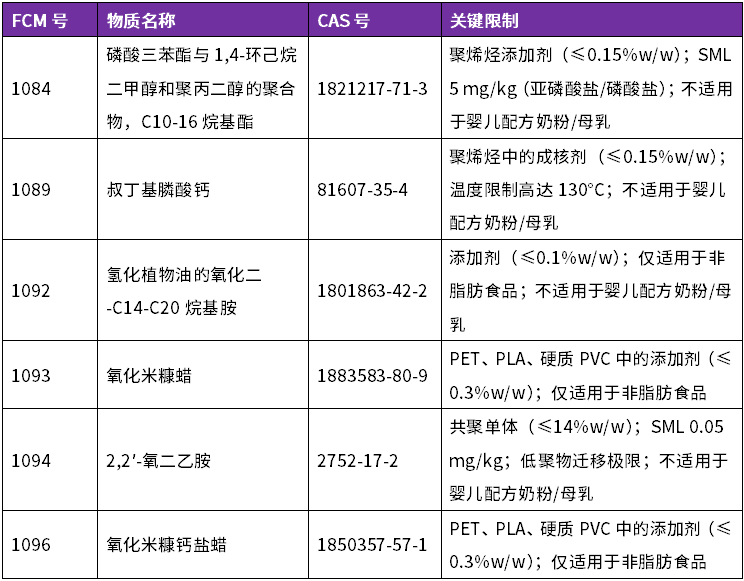 该更新扩大了可用于制造塑料食品接触材料的授权物质清单。这六种新授权的物质都有特定的使用条件,包括迁移限制和限制。具体要求如下: