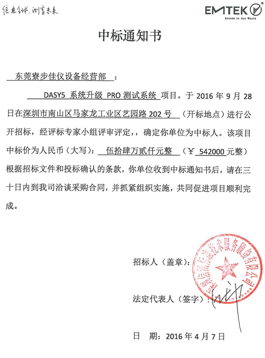 佳仪设备中标通知书