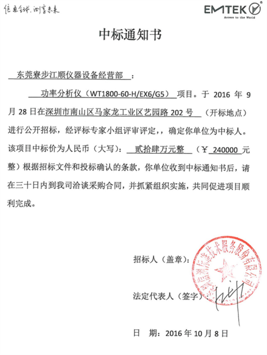 江顺仪器设备中标通知书